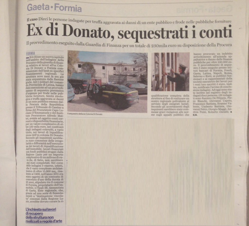 “Frode nelle pubbliche forniture, falsità ideologica e truffa aggravata ai danni di un ente pubblico per la mancata riqualificazione dell’ex Colonia Di Donato a Formia. Dopo il sequestro della storica struttura nel gennaio scorso, apprendiamo che la Procura della Repubblica di Cassino ha chiuso le indagini nei confronti di dieci indagati (ne restano indagati otto ndr) e, con provvedimento di sequestro preventivo d’urgenza, ha bloccato 230mila euro dai loro conti correnti.